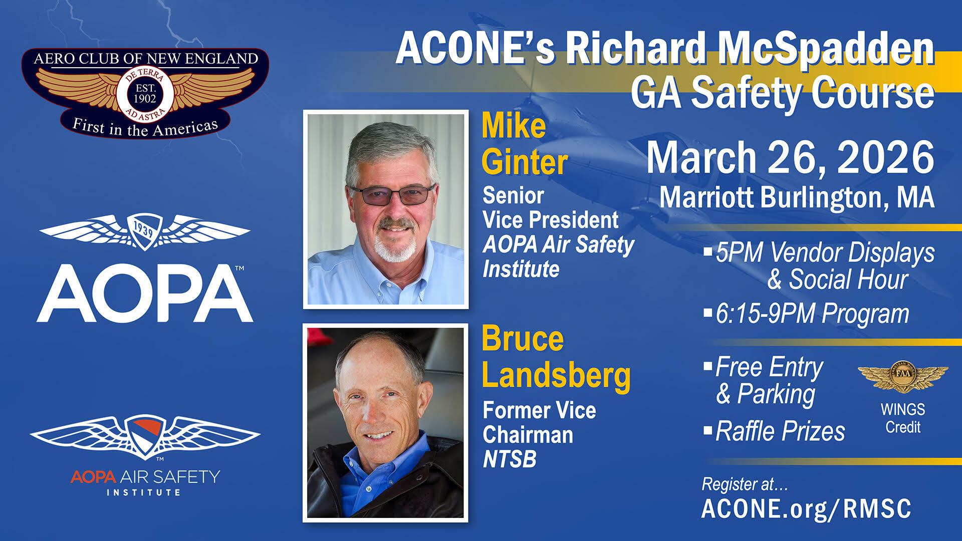 The Aero Club of New England (ACONE), America's First Aero Club, will hold its 36th annual in-person General Aviation (GA) safety evening on Thursday, March 26th from 5-9 PM, at the Boston Marriott in Burlington, MA.